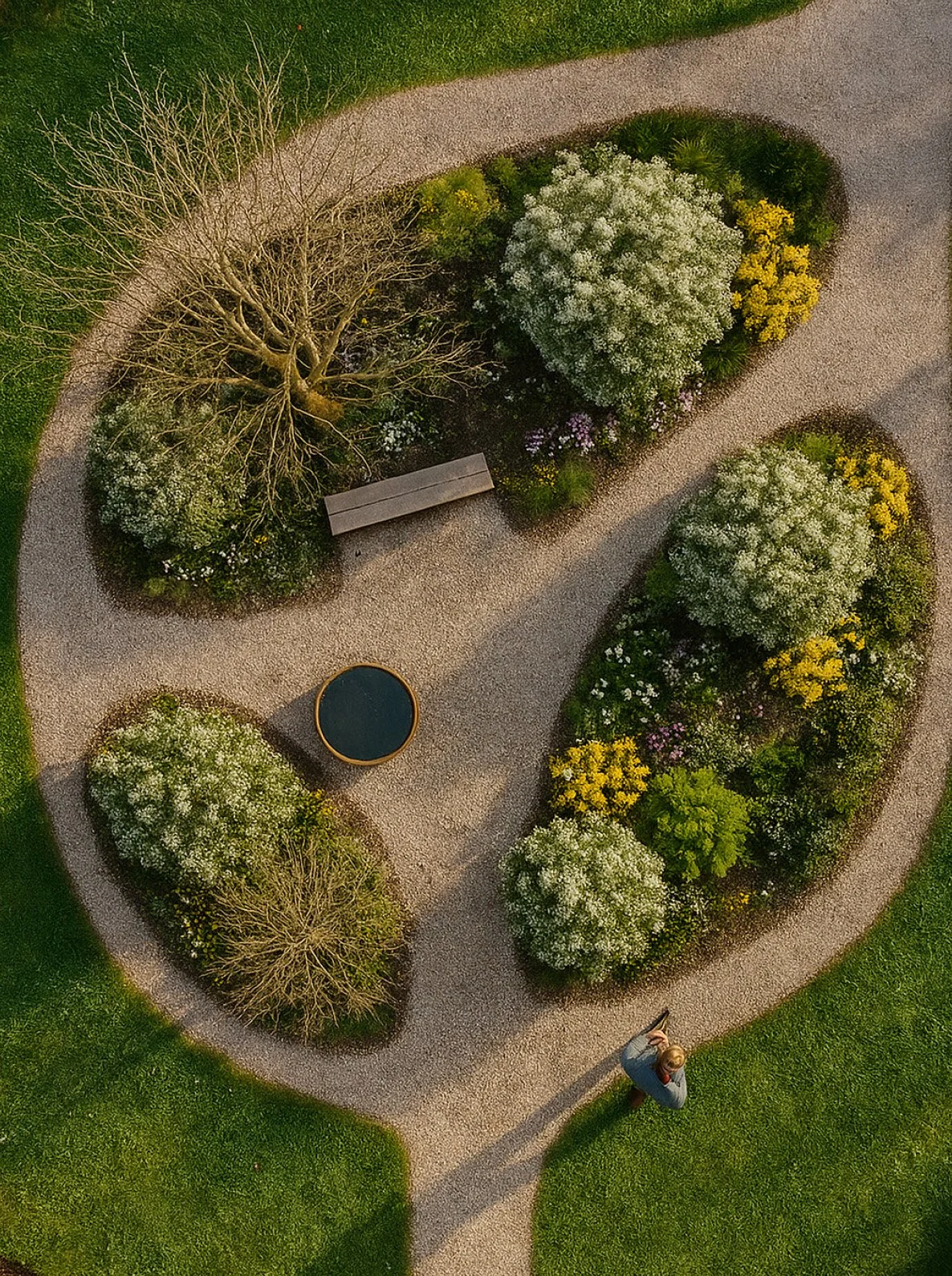 This contemplative garden room sits between two active program zones, offering a quiet pause within the site sequence. A bench faces a curated mix of perennial flowers and grasses, with an existing mature tree providing summer shade. Planting and form create an enclosure while keeping the space open and accessible. A central circular water basin reflects the sky and provides drinking water for birds.
